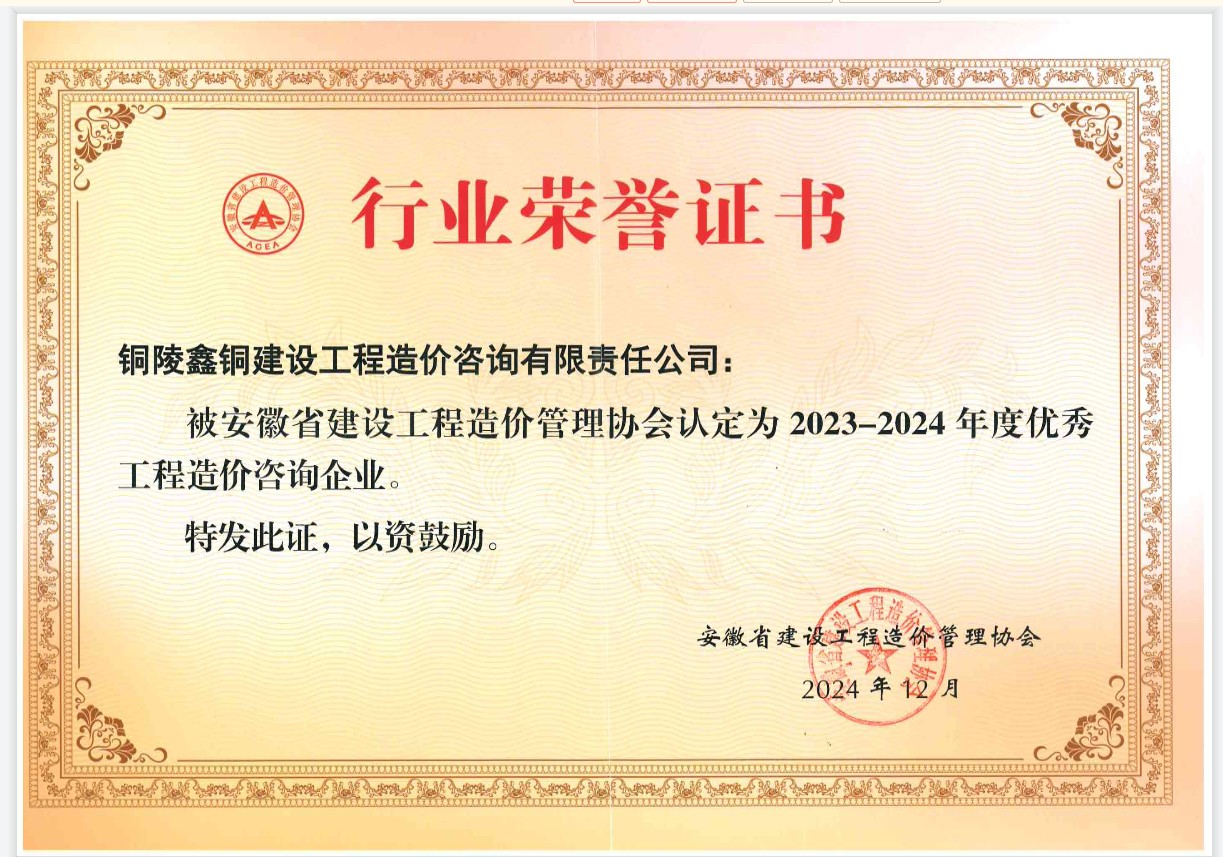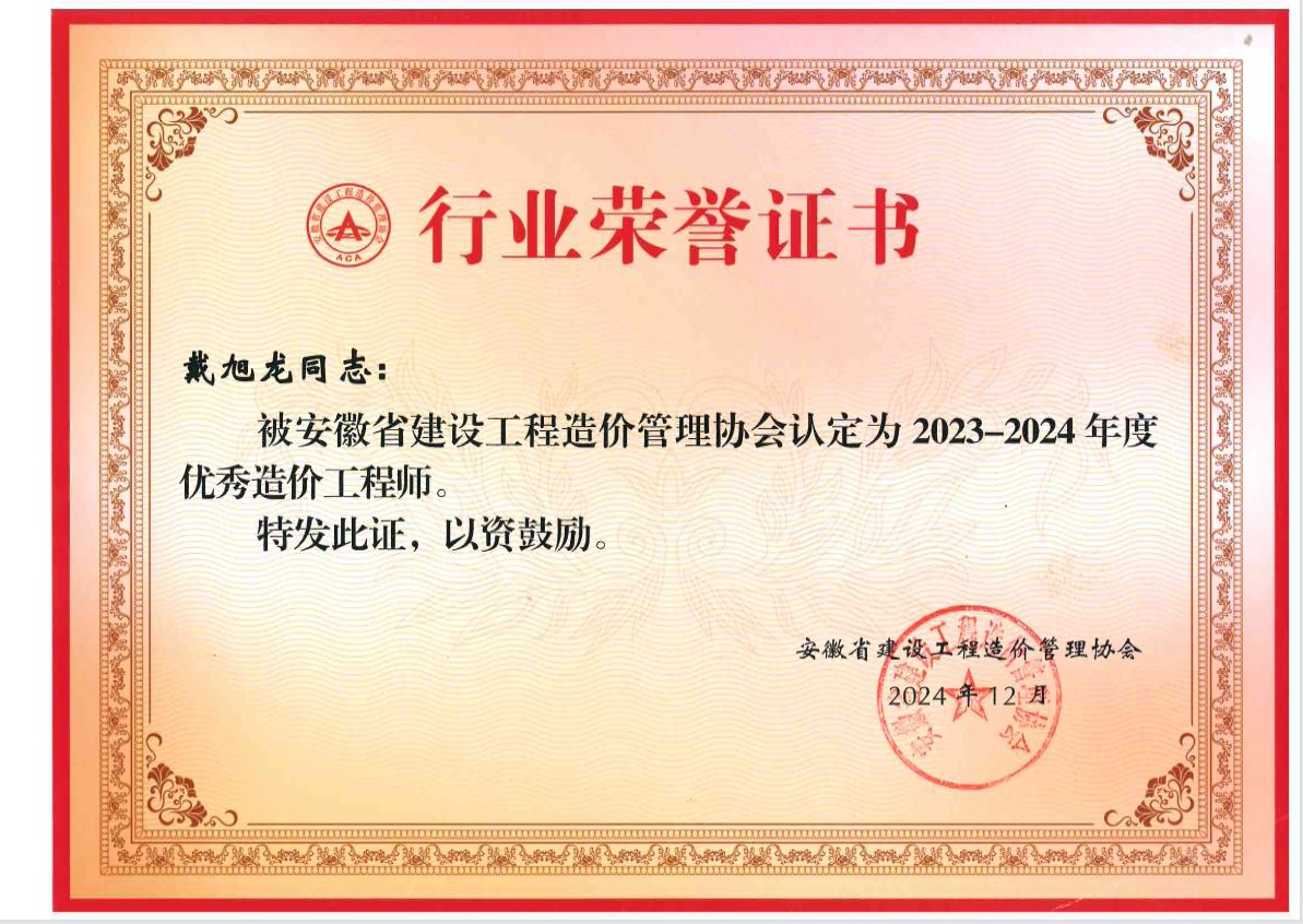 日前,鑫銅造價(jià)被安徽省建設(shè)工程造價(jià)管理協(xié)會(huì)認(rèn)定為“2023-2024年度優(yōu)秀工程造價(jià)咨詢企業(yè)”。戴旭龍同志榮獲“2023-2024年度優(yōu)秀造價(jià)工程師”稱號(hào)。